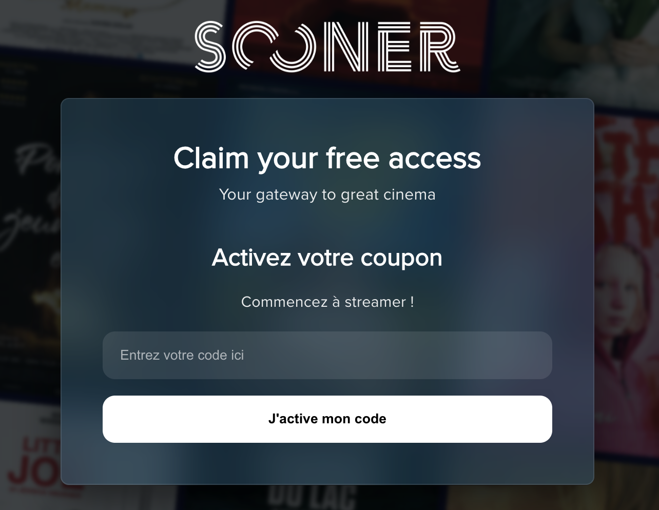 Si vous avez reçu un code promo pour une offre gratuite, rendez-vous sur stream.sooner.be/fr/coupons. Entrez votre code dans l'espace réservé et cliquez ensuite sur "J'active mon code". Il vous sera ensuite demandé de vous connecter à votre compte ou de vous en créer un si vous n'êtes pas déjà client.e chez nous. Une fois connecté.e, vous pourrez profiter de votre offre.
