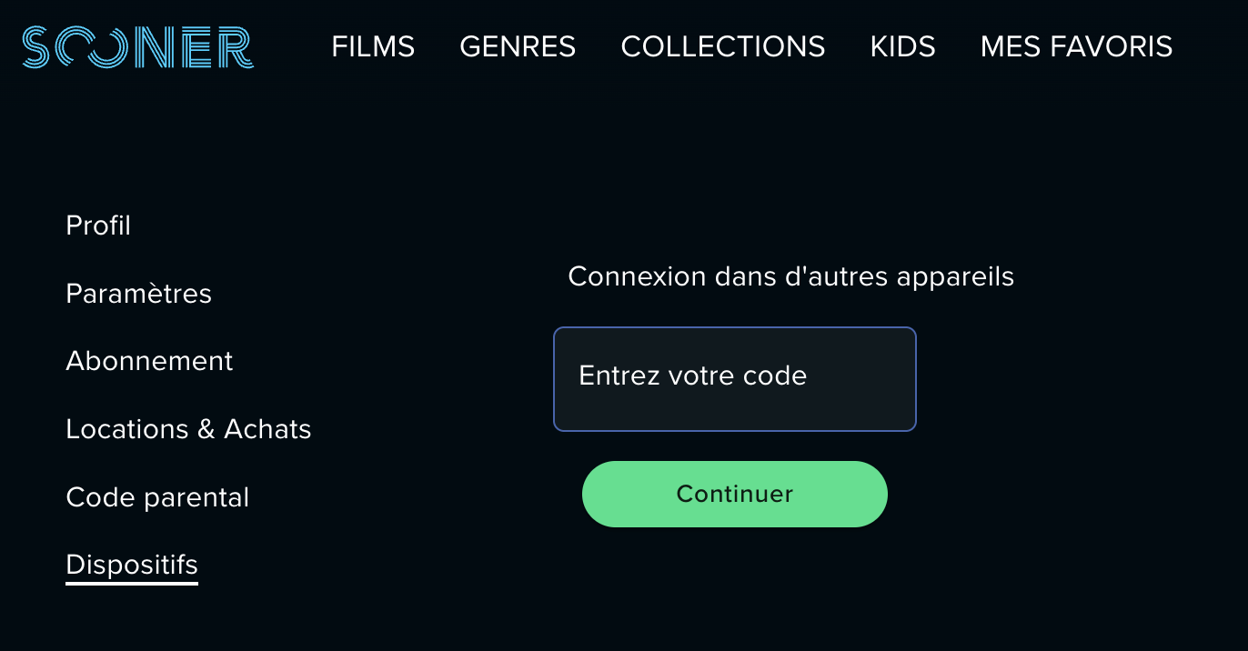 - Retournez sur le site web Sooner et entrez le code affiché sur votre appareil. Assurez-vous de bien saisir le code correctement. Cliquez ensuite sur "Continuer" pour valider le code.